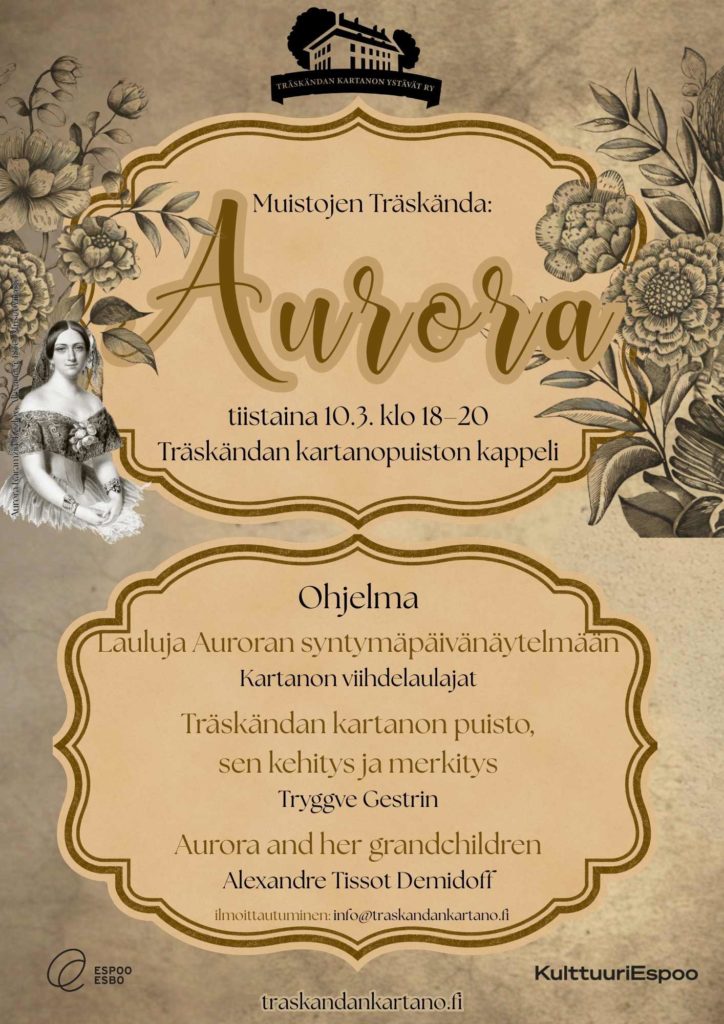 Päivän kunniaksi järjestämme tilaisuuden ”Muistojen Träskända: Aurora” klo 18-20 Träskändan kartanopuiston kappelissa.